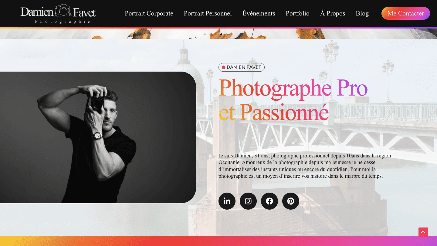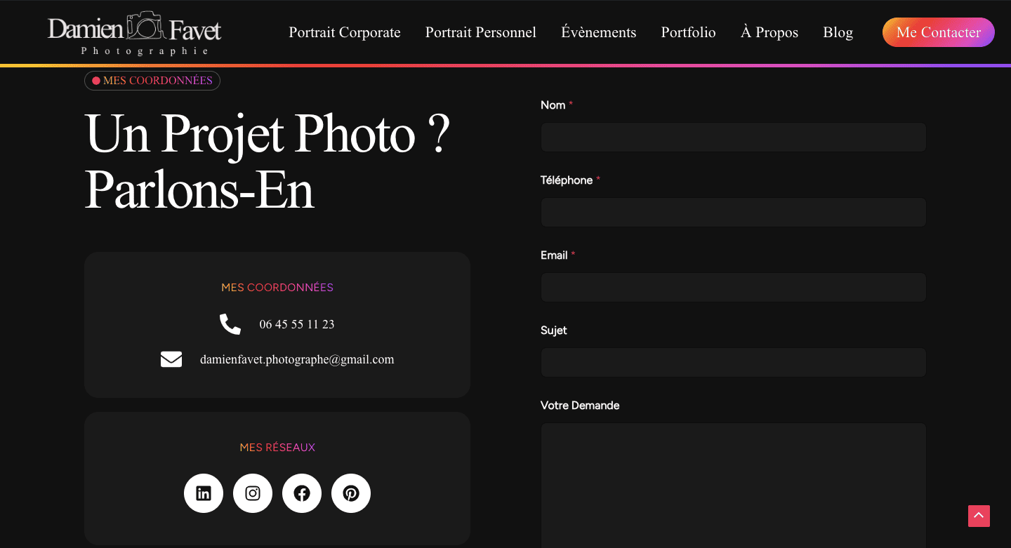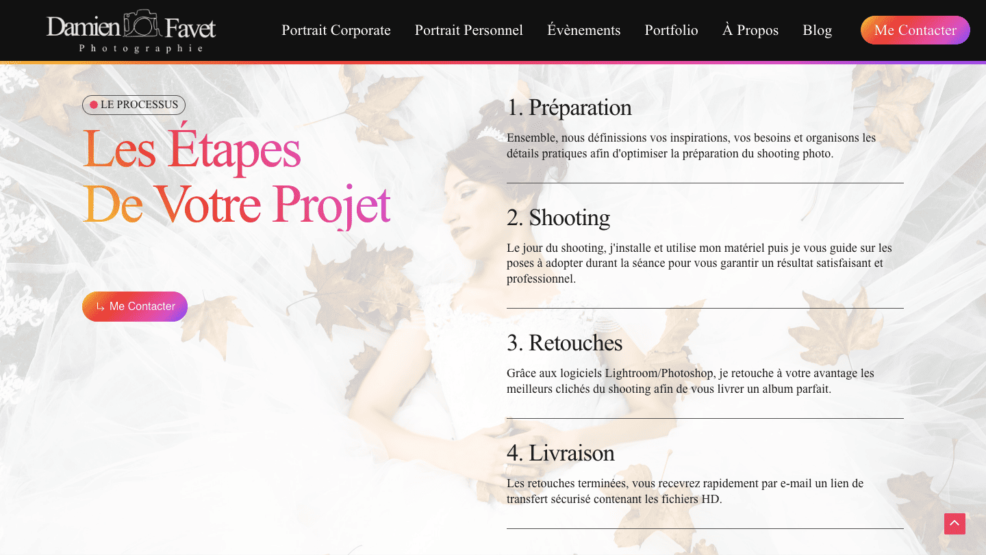 Ce projet consiste en la création d’un site vitrine sur mesure pour Damien Favet, photographe professionnel mêlant mariages, corporate et personnel.
