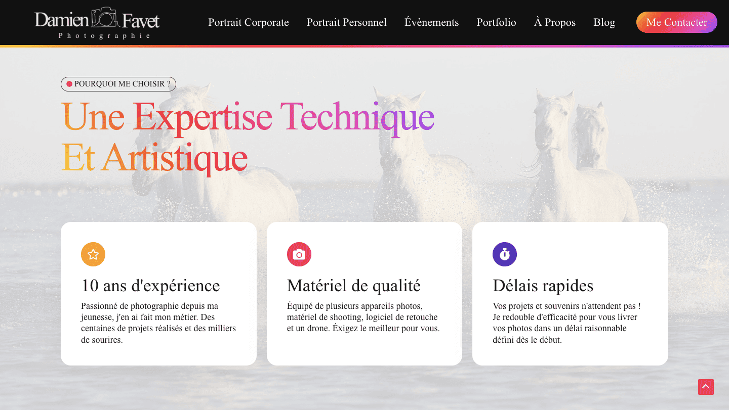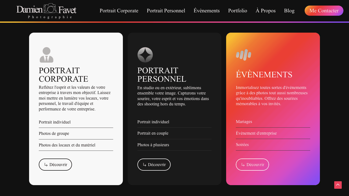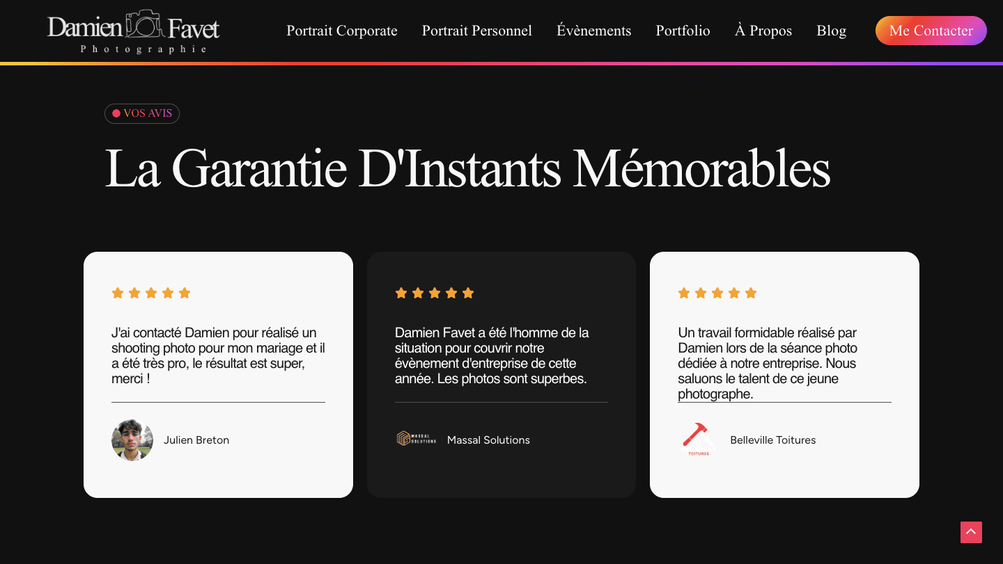 Ce projet consiste en la création d’un site vitrine sur mesure pour Damien Favet, photographe professionnel mêlant mariages, corporate et personnel.